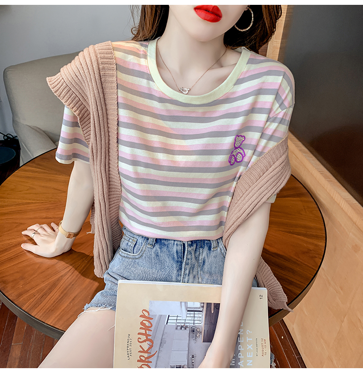 | 商品名称 | 欧貝汐2021夏韓国版新商品ファッションゆったり半袖上着気質百合虹ストライプTシャ女オレンジストライプL |