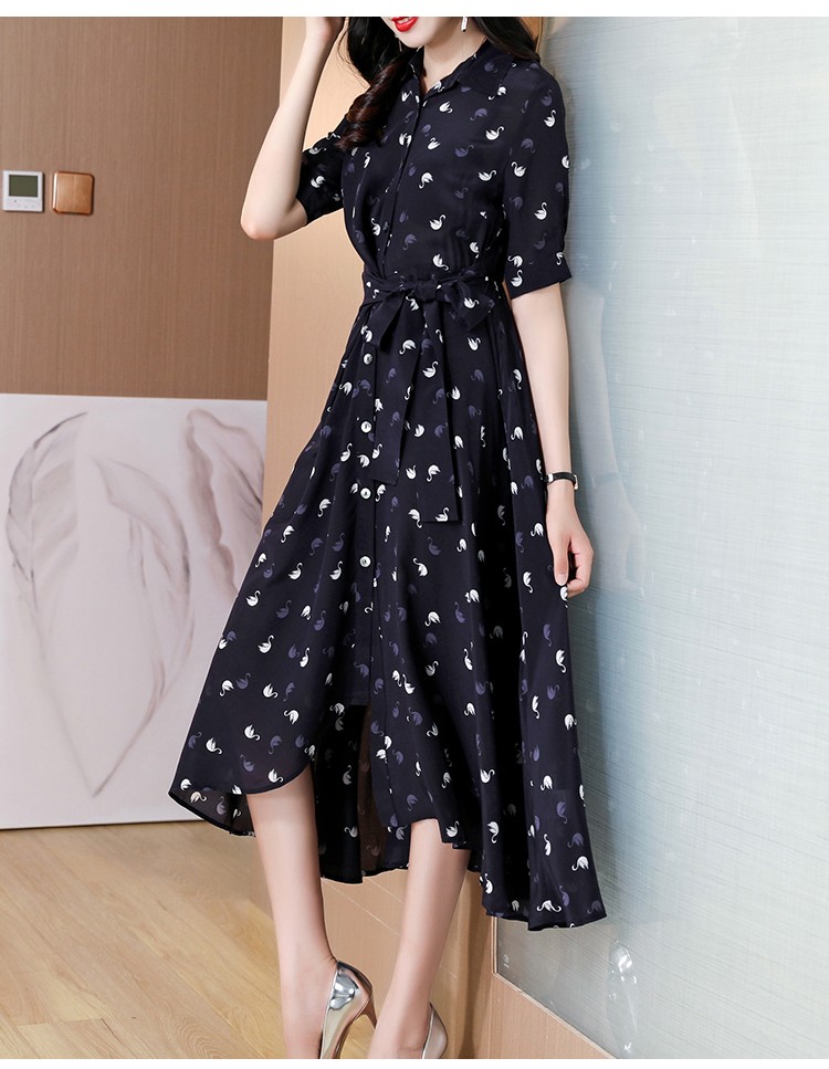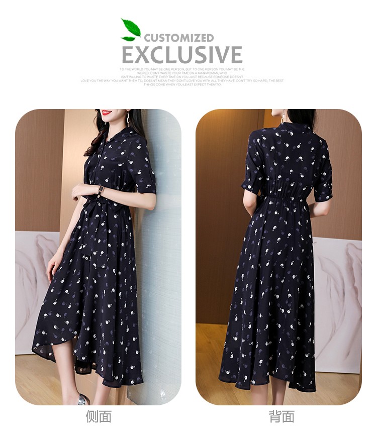 スカッとしたシャツワンピス2021夏新着商品女装法式気質OLデザイン感腰系プリントの中の長いサイズのワンピス夏蔵青(サイズMから3 XL)は伝言サイズを注文すればいいです。または、相談商に相談してください。